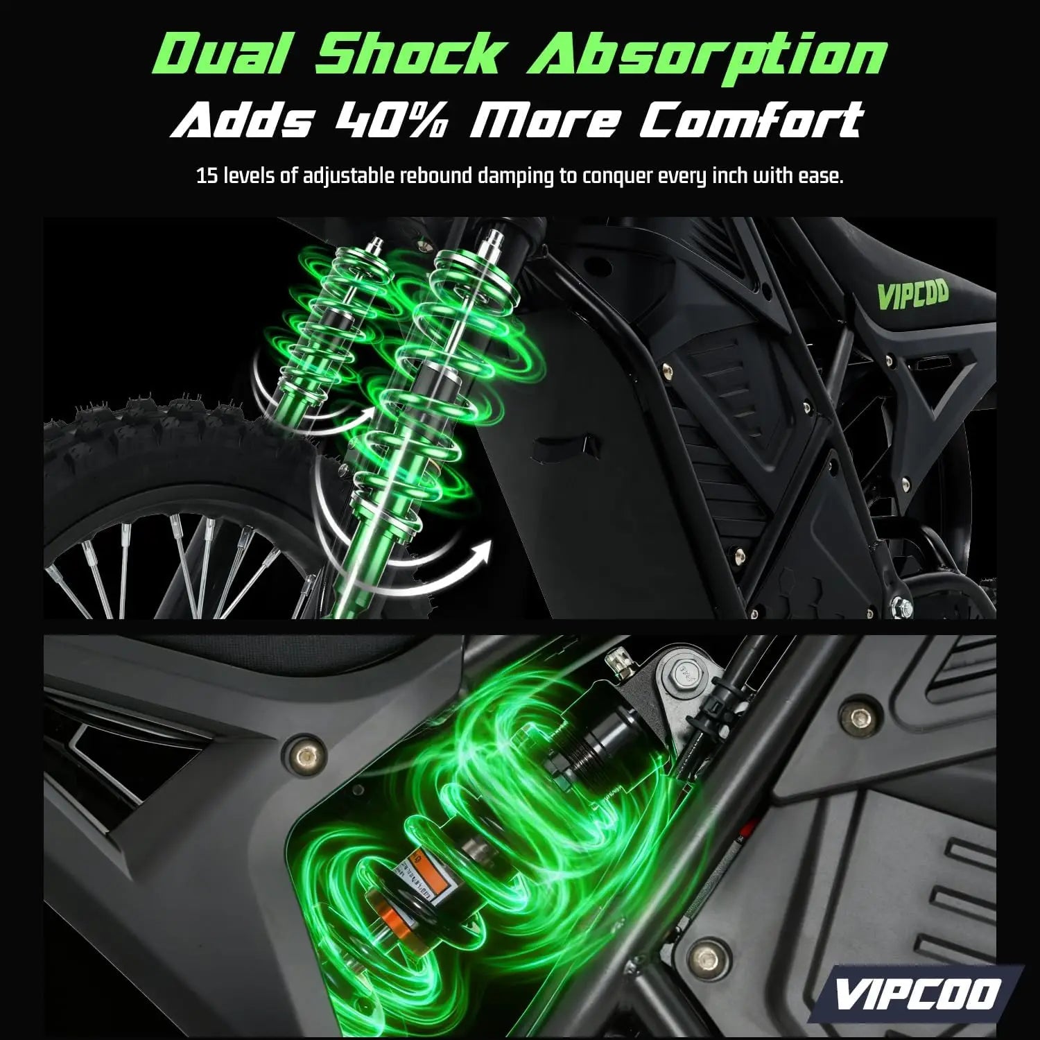 【Three Speed Intelligent Switching+Dual Disc Brake System】1 gear: 17 MPH(27KM/H), 2 gear: 22 MPH(35KM/H), 3 gear: 40 MPH(63KM/H), meeting the terrain requirements of the scientific coverage group. VIPCOO H3 Electric Motorcycle Dirt Bike for teens adults paired with dual disc brake systems, the braking distance is reduced by 30% compared to traditional systems at a speed of 45 miles per hour, ensuring safe and efficient driving on both steep slopes and high-speed off-road conditions.