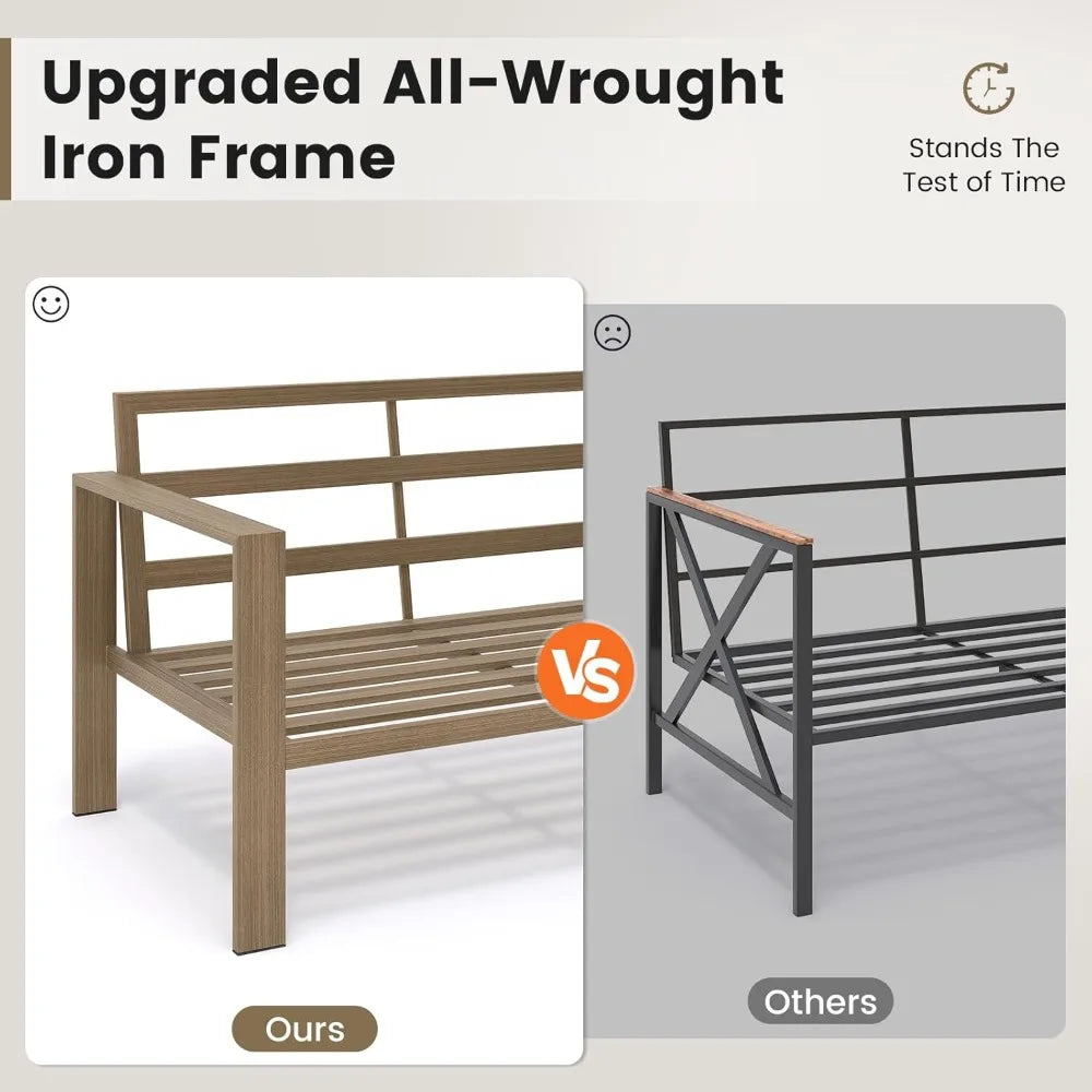 6 Piece Patio Furniture Set, Faux Wood Metal Outdoor Sectional Sofa with 6" Thick Olefin Cushions, Wide Armrest & Coffee Table