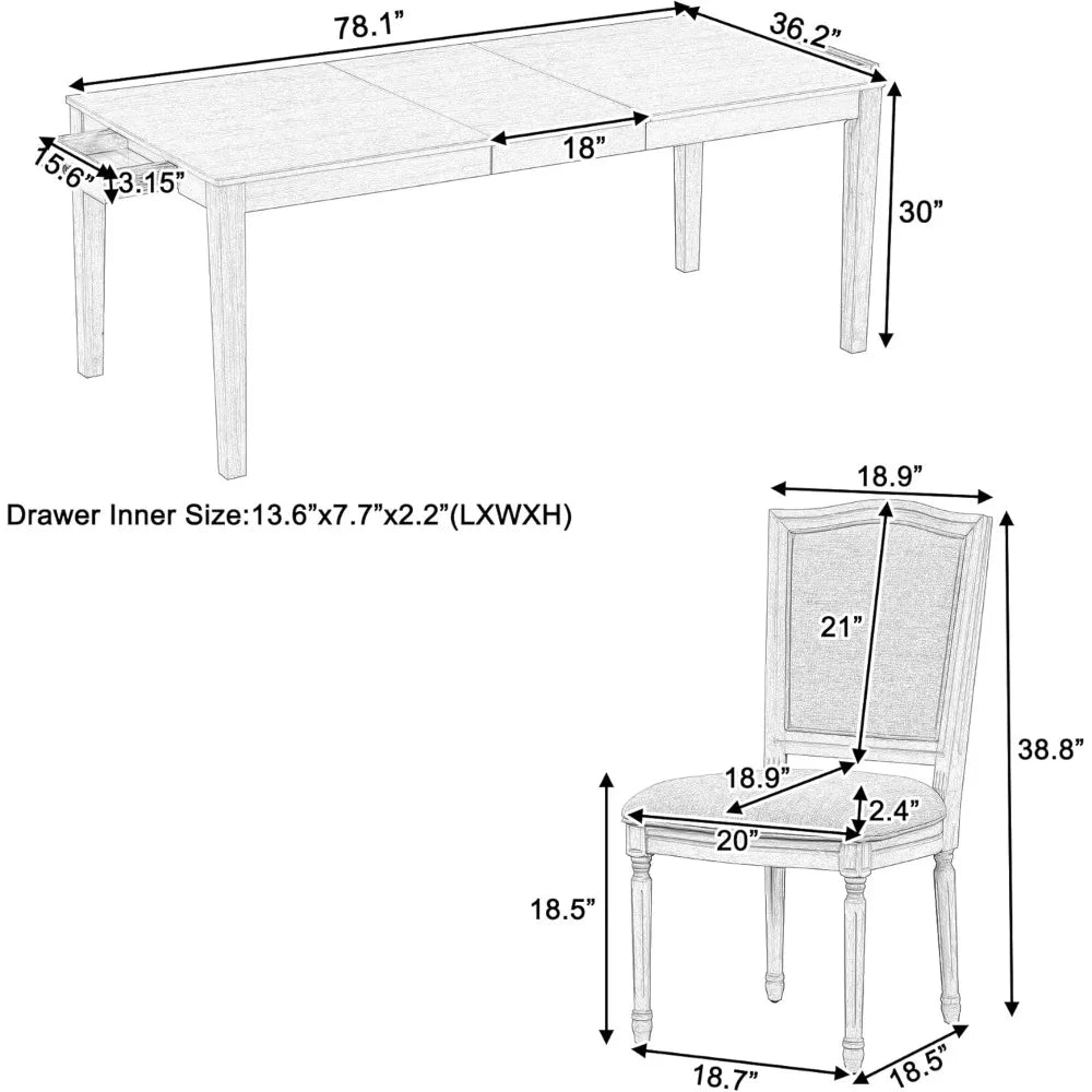- [Dimension & Assembly] Table: 60.1-78.1x36.2x30(LxWxH); Chair:18.7x18.5x38.8inch(LxWxH); Seat to ground: 18.5inch; Each Drawer Inner Size: 13.6x7.7x2.2inch(LXWXH). This dining table set comes with detailed instructions that can be followed step by step to help you complete the assembly as quickly as possible.