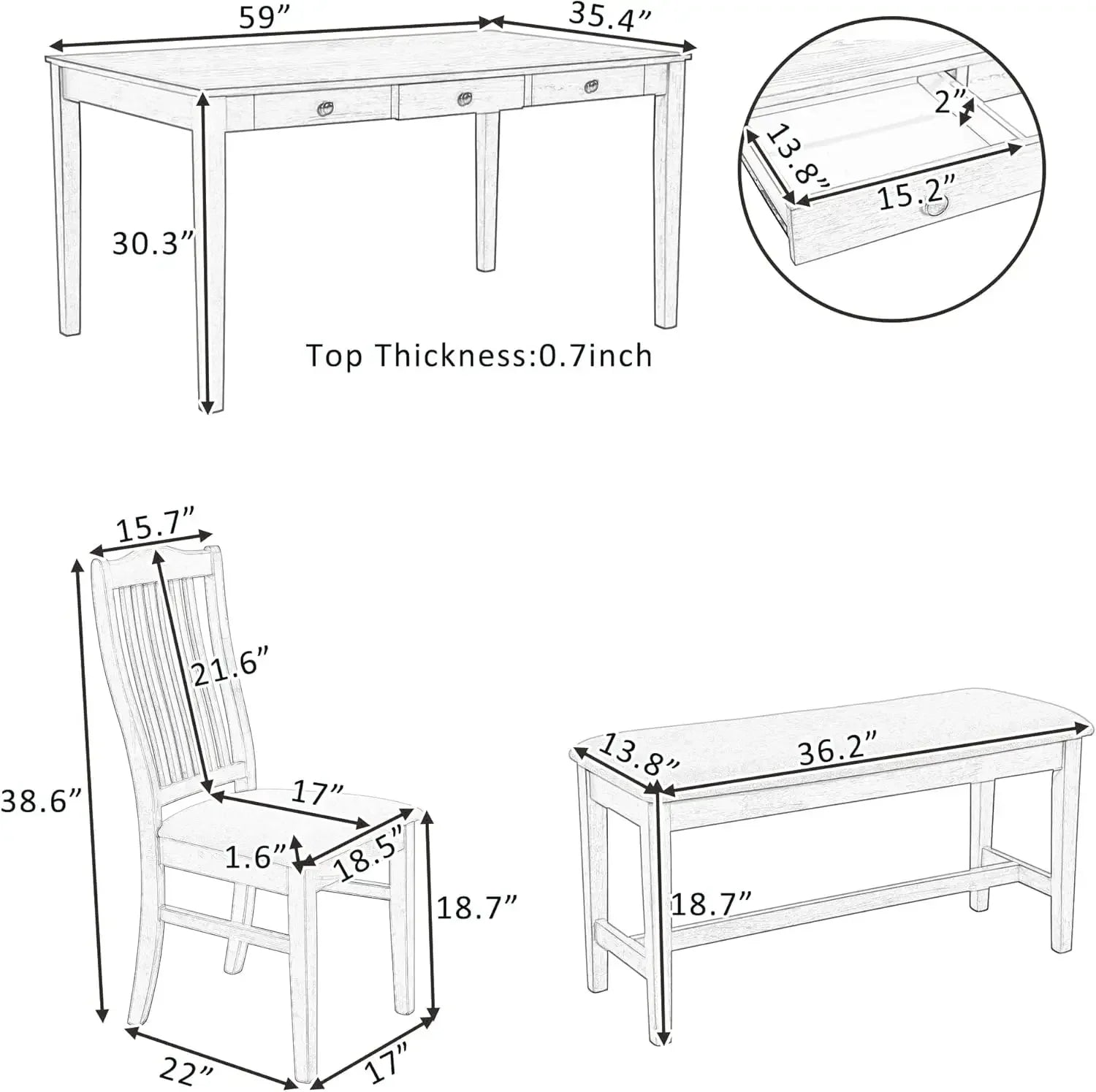 - Easy Assembly & Dimension---Easy set up with clear manual instructions included. Table Dimensions:59x35.4x30.3inch(LXWXH); Chair Dimensions: 22x17x38.6inch(LXWXH); Bench Dimensions:36.2x13.8x18.7inch(LXWXH). Tabletop weight capacity: 250lbs; Chair weight capacity: 250lbs/piece; Bench weight capacity:250lbs.