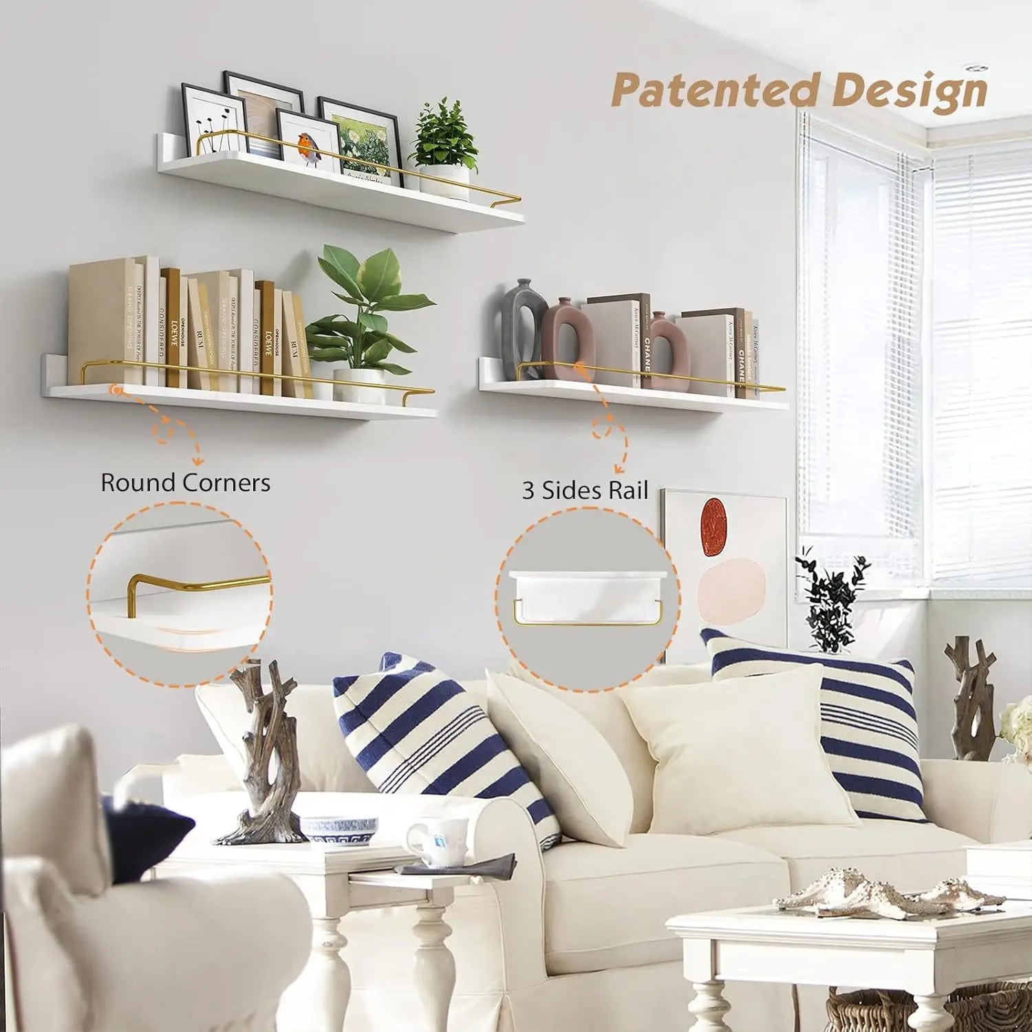 Elegant Gold Bathroom Shelves Set of 3, 24 Inch Wall Mounted Above Toilet Shelves with Rails, White and Gold for Modern Home