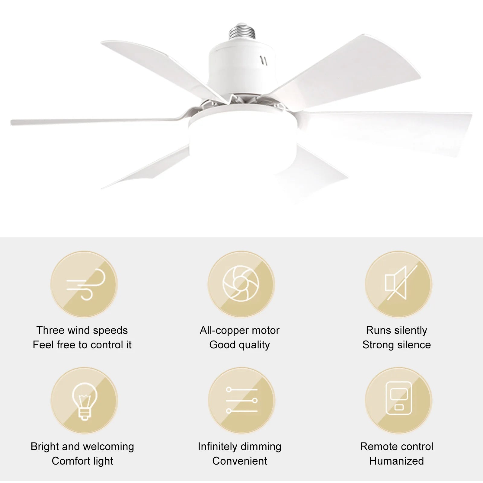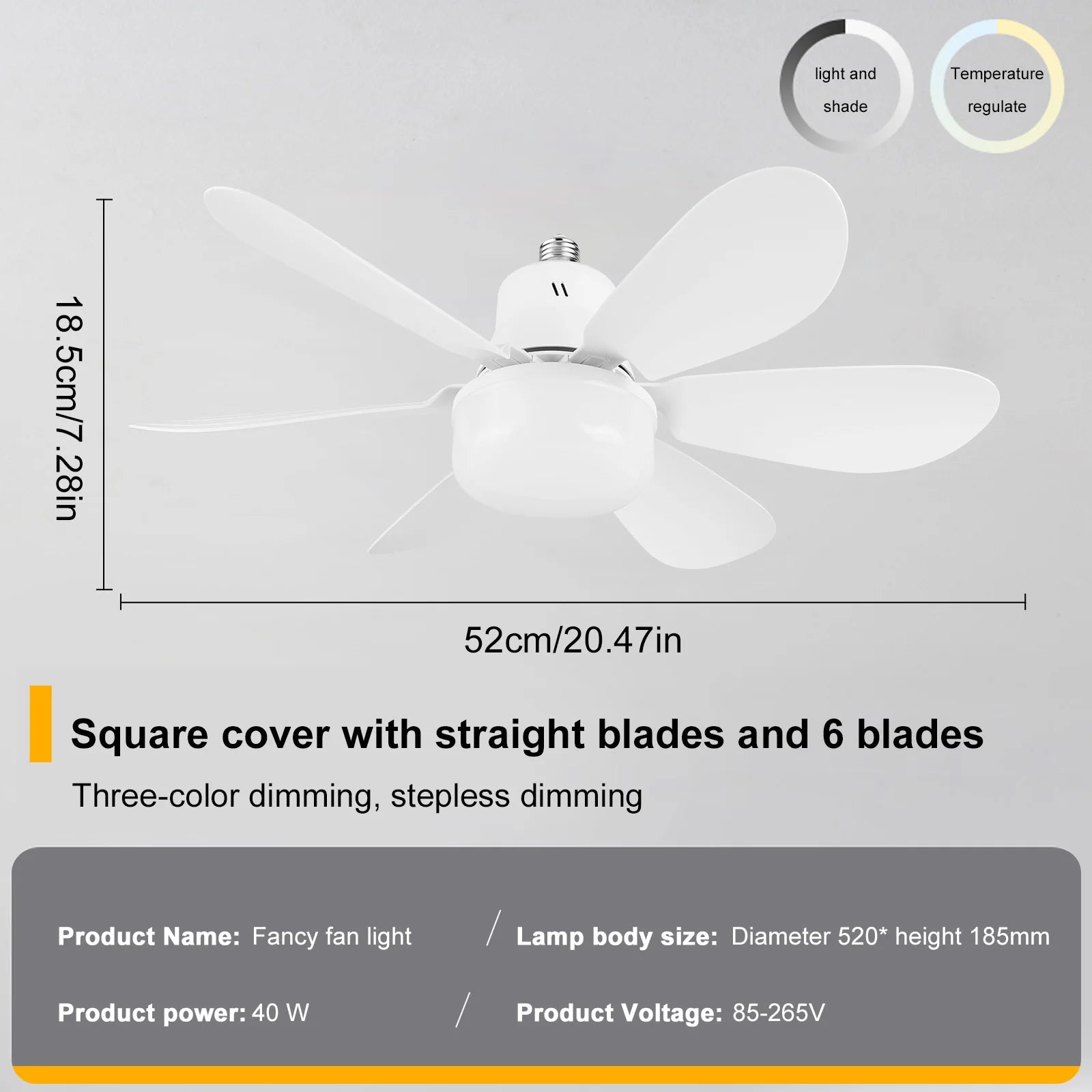 1. Stylish Versatility: The socket fan light features a sleek white design that seamlessly integrates with diverse home decor styles, making it easy to find the perfect match for your interior aesthetic and enhance your living space. 2. Convenient Control: With a user-friendly remote control, you can effortlessly adjust the light's color, brightness, and fan speed from anywhere in the room, providing a comfortable and personalized experience. 3. Customizable Lighting: Offering a color temperature range from 3000K to 6500K, this ceiling fan light allows you to tailor the lighting ambiance to suit different times and occasions, enhancing your home environment. 4. Energy Efficiency: The ceiling fan with light utilizes 18W SMD 2835 LEDs, delivering bright and effective illumination while significantly reducing energy consumption, making it both environmentally friendly and cost-effective. 5. Smart Timing Function: The screw in ceiling fan in light socket features a built-in timer, you can easily schedule the light's on and off times, enhancing convenience and promoting a smarter, safer, and more comfortable living experience.